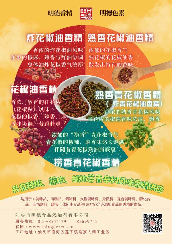 明德 花椒香精 細分為 紅色的花椒風味,綠色的青花椒風味,炸花椒風味等等。